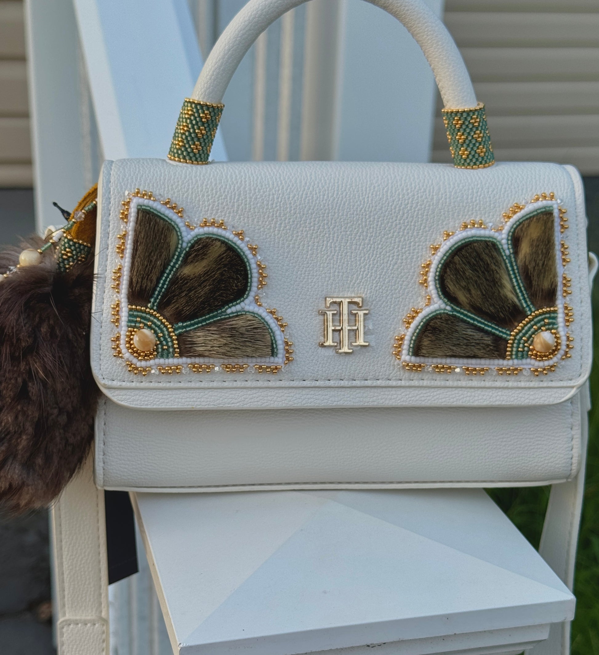 sealskin, 24kt beads, mother of pearl rounds, clear crystals, matching beaver and moose hide key charm.